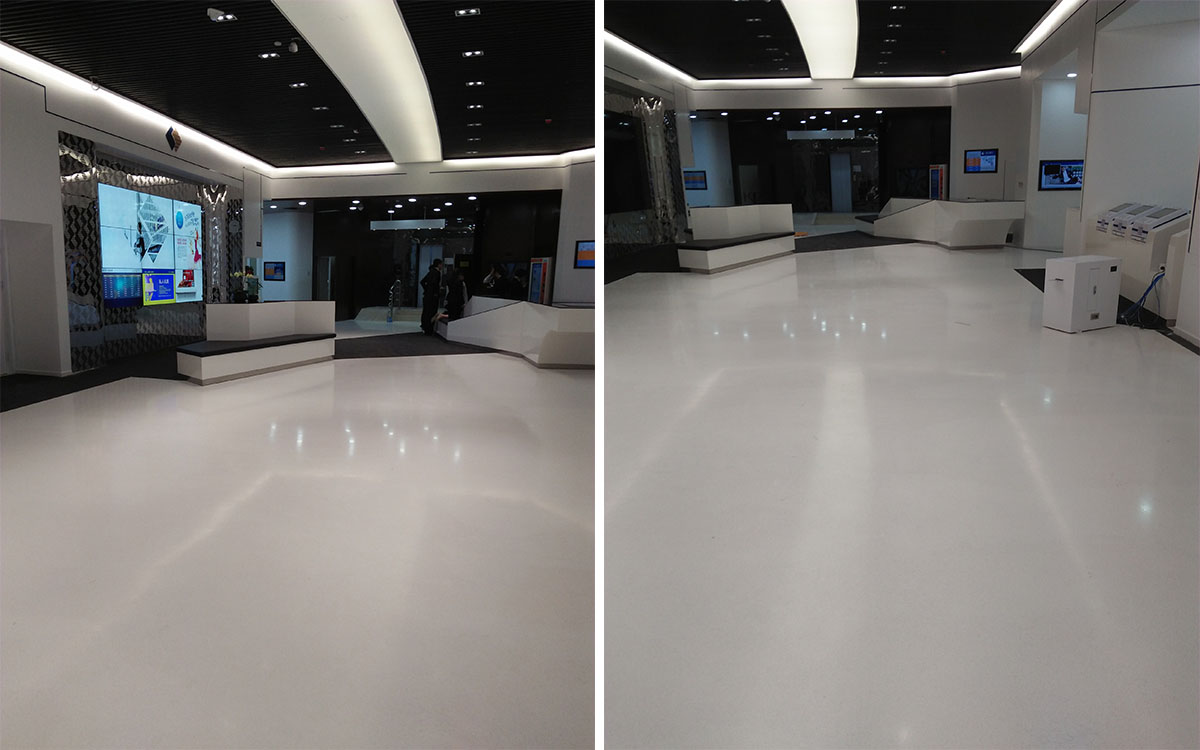 這種筆直的粗線條就像恒豐的標(biāo)志映射在整個空間內(nèi)。大面積白色金磨石地面所對應(yīng)的頂面使用了大量的白色射燈,強烈的燈光映射在光亮、平整潔白的地面顯得特別的明亮、大氣!