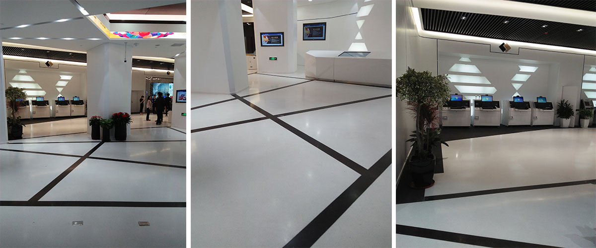恒豐銀行地面以白色金磨石為主打色,以黑色線條點綴分隔空間。