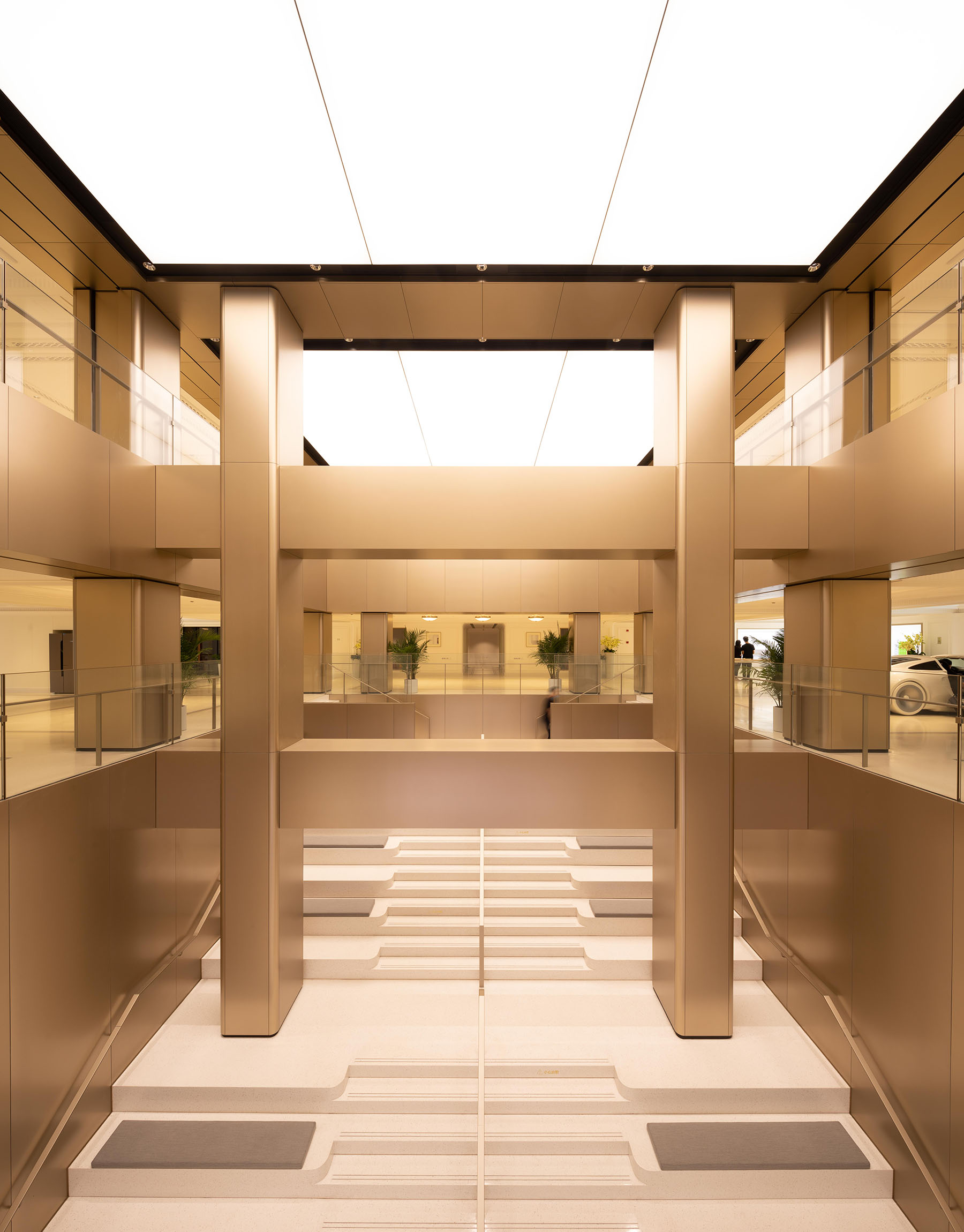 墻面地面一體化金磨石運用,使室內(nèi)整體感大幅度提升,金磨石光滑平整的優(yōu)點在中庭燈光的映襯下得到完美體現(xiàn)