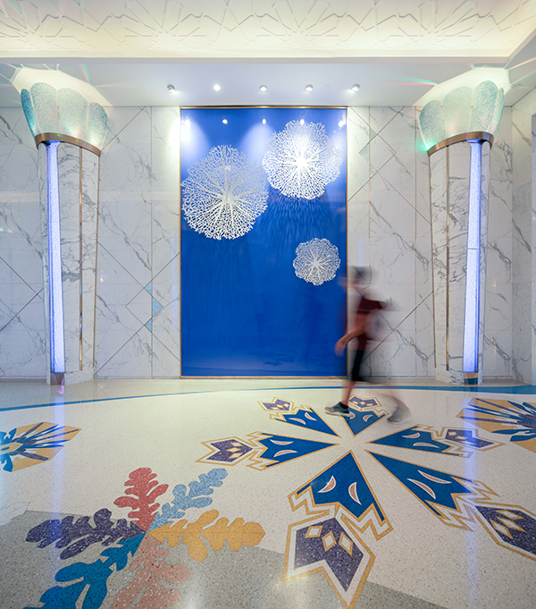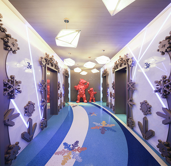 銀基冰雪酒店作為夏日度假酒店,“冰雪”是主打的特色大堂作為整個酒店的亮點,以藍色為主基調(diào),配合地面五彩雪花圖案