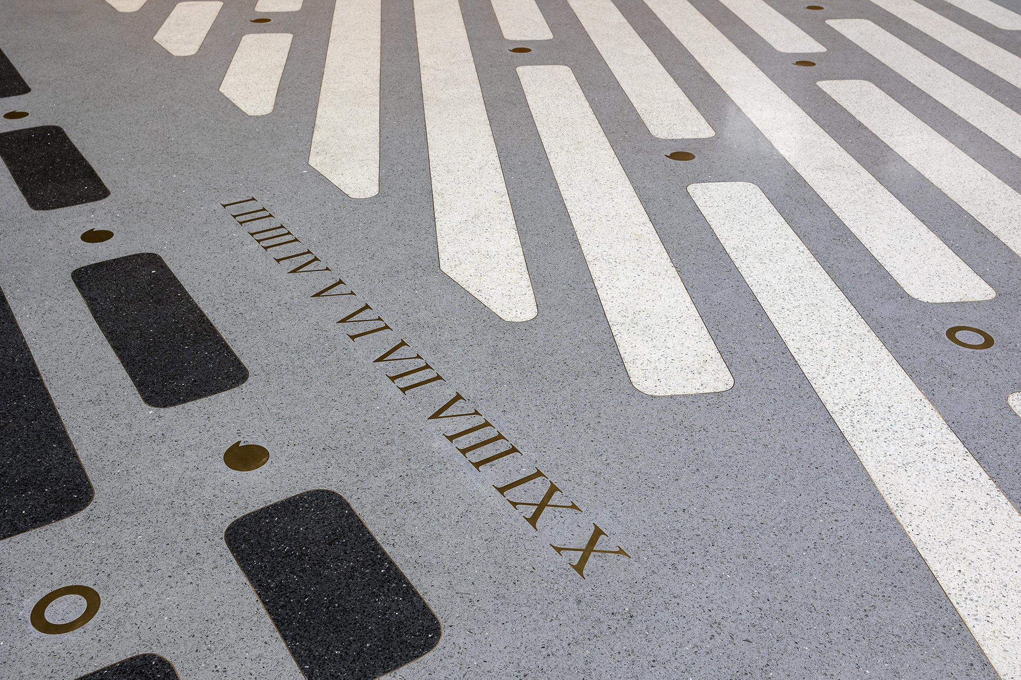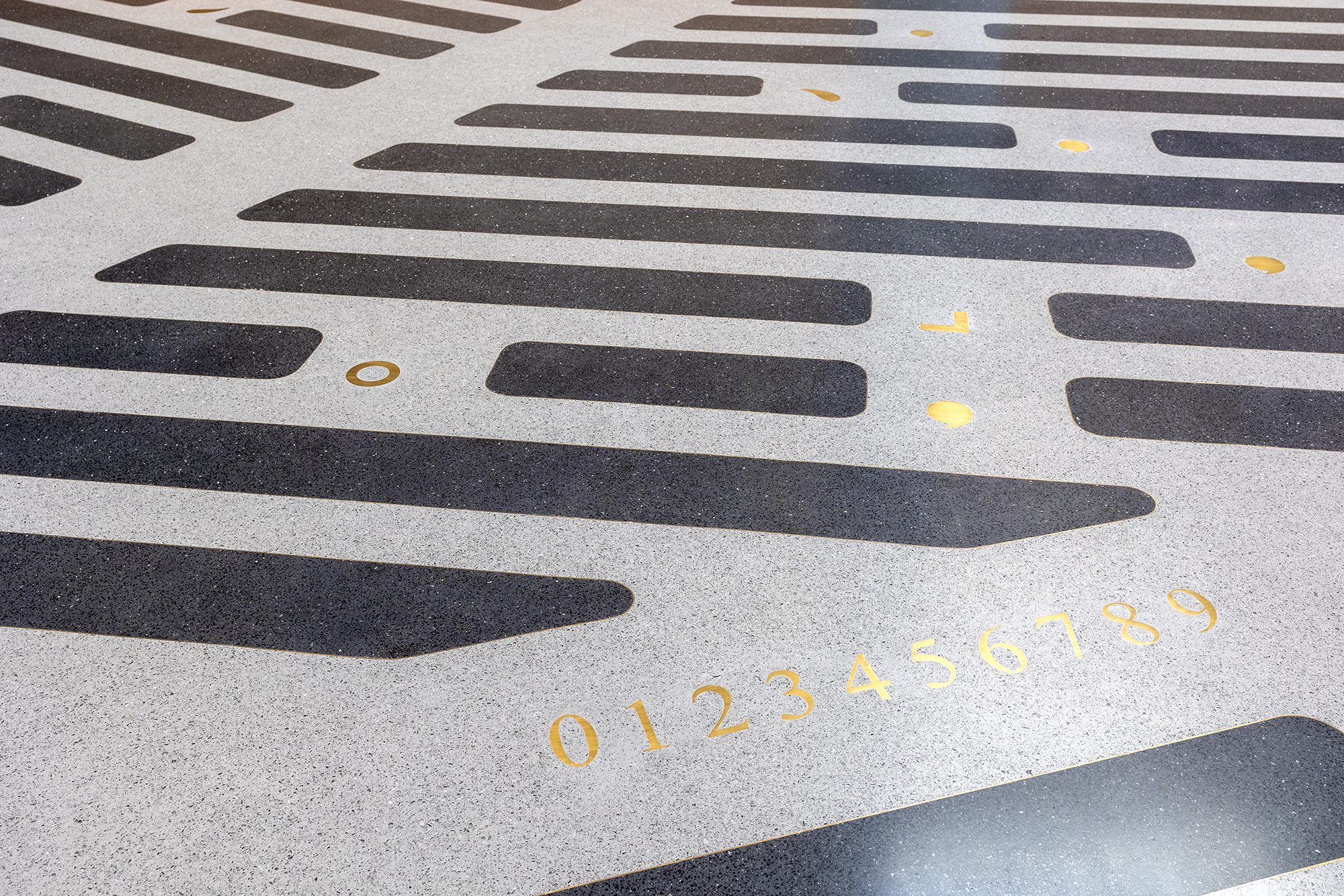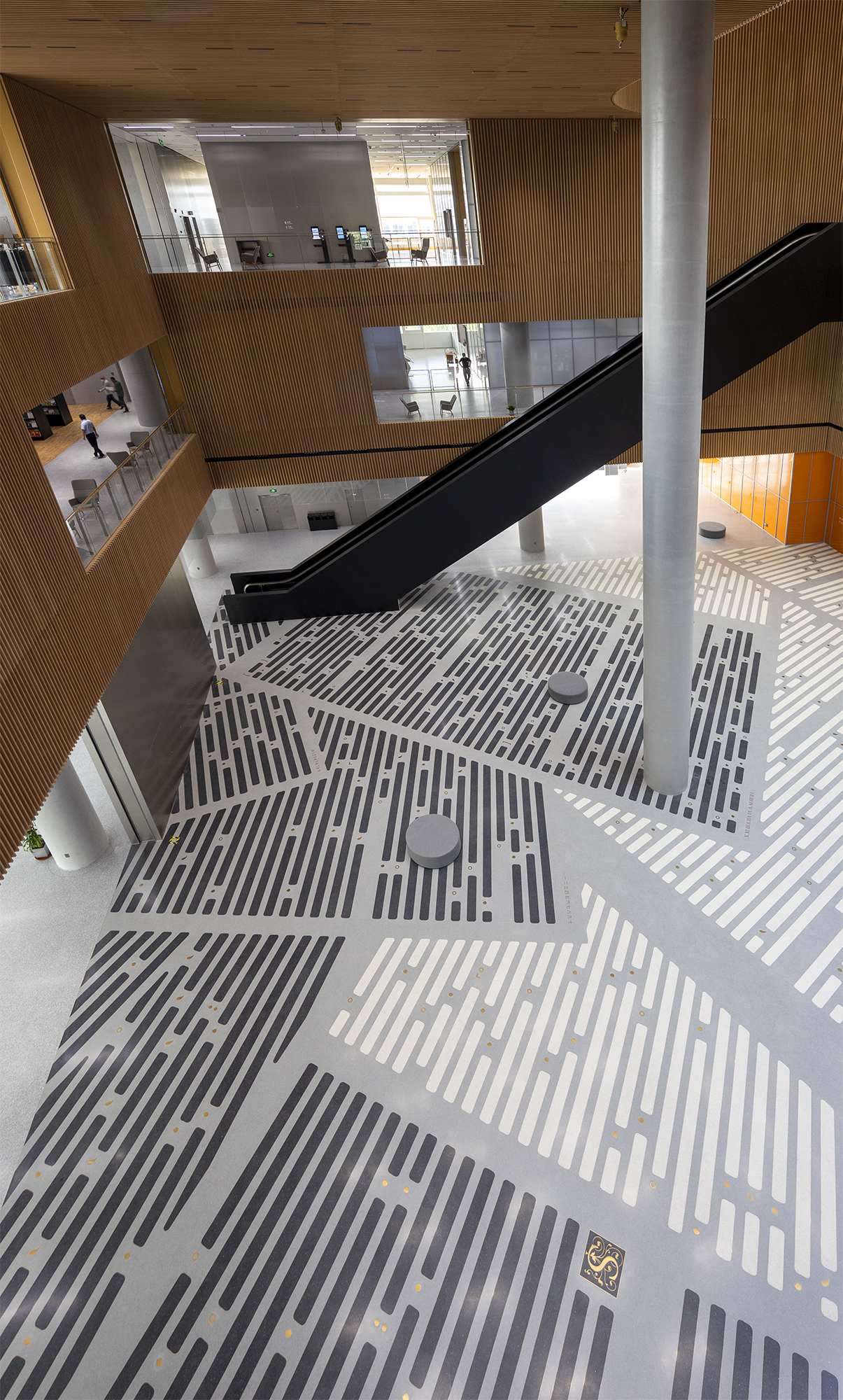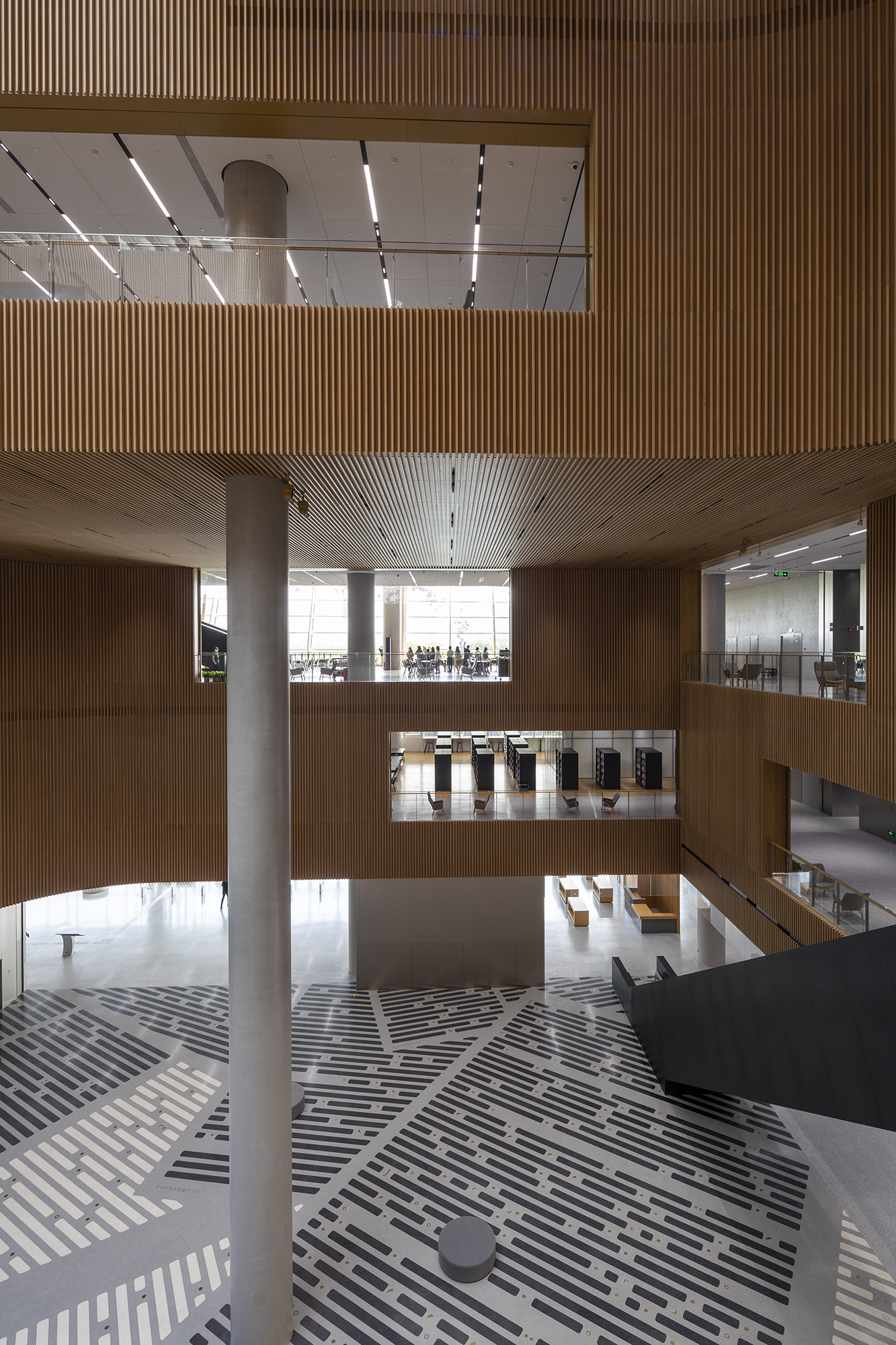 場館最大亮點中庭,是藝術(shù)家申凡的藝術(shù)作品《往來春秋》——以老報紙為創(chuàng)作原型,讓長短的文字抽象化為黑白線條,只留下標(biāo)點符號作為分隔——層疊交錯,仿佛隨意置于書桌上的報紙。